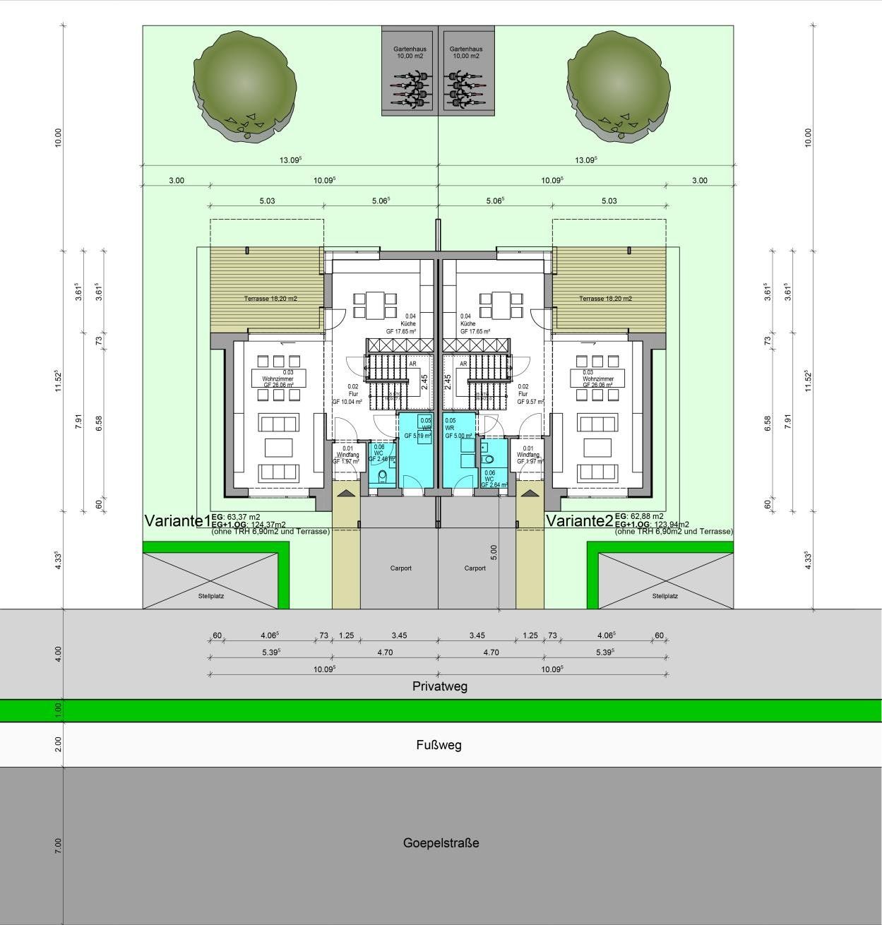 hat uns in der TeGeCe beschäftigt. Mit unserem Team haben wir uns für die Weiterentwicklung der Stadt interessiert. Mit unserer Schwestergesellschaft, der Wohungswirtschaft Frankfurt (Oder) GmbH haben wir Ideen konzipiert, Wohnungsbauvorhaben im Rahmen unserer Möglichkeiten zu entwickeln und dabei die Wowi mit unseren Ressourcen zu unterstützen. So entstand dieser Vorentwurf für eine Anlage von Doppelhäusern im Bereich Goepelstraße / Pflaumenweg. Eine Grundstücksbrache sollte auf diese Weise in einen modernen kleinen Wohnungsbaustandort umgewandelt werden.